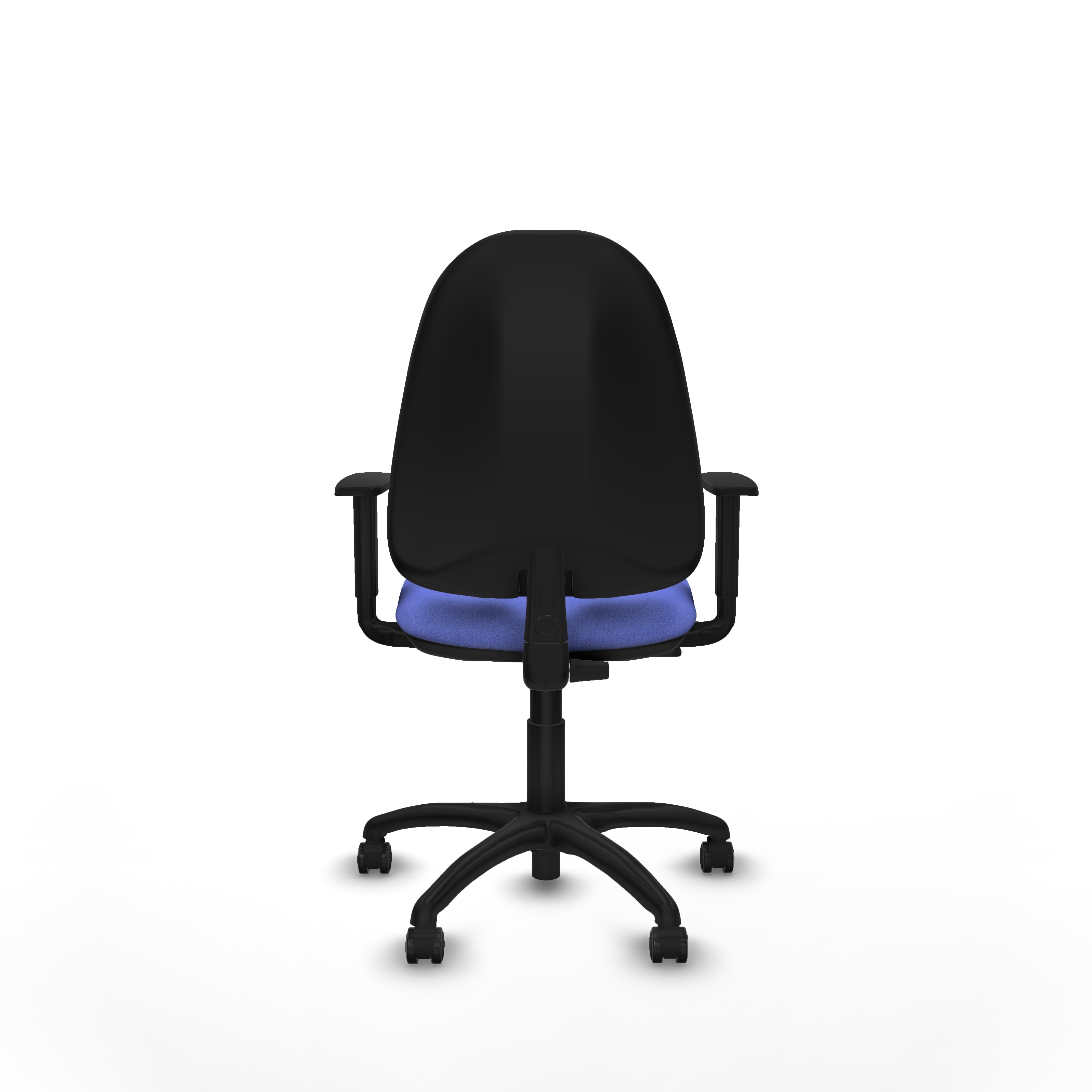 Equipada con ruedas de nailon autofrenantes de 5 cm de diámetro, con eje interno y perno de acero de 11 mm, garantiza movilidad segura y duradera. La base de poliamida negra, con 5 radios y 60 cm de diámetro, aporta estabilidad y resistencia. Su mecanismo incluye regulación del respaldo en altura, inclinación y profundidad, además de ser giratorio y contar con ajuste de altura del asiento, facilitando una postura óptima.