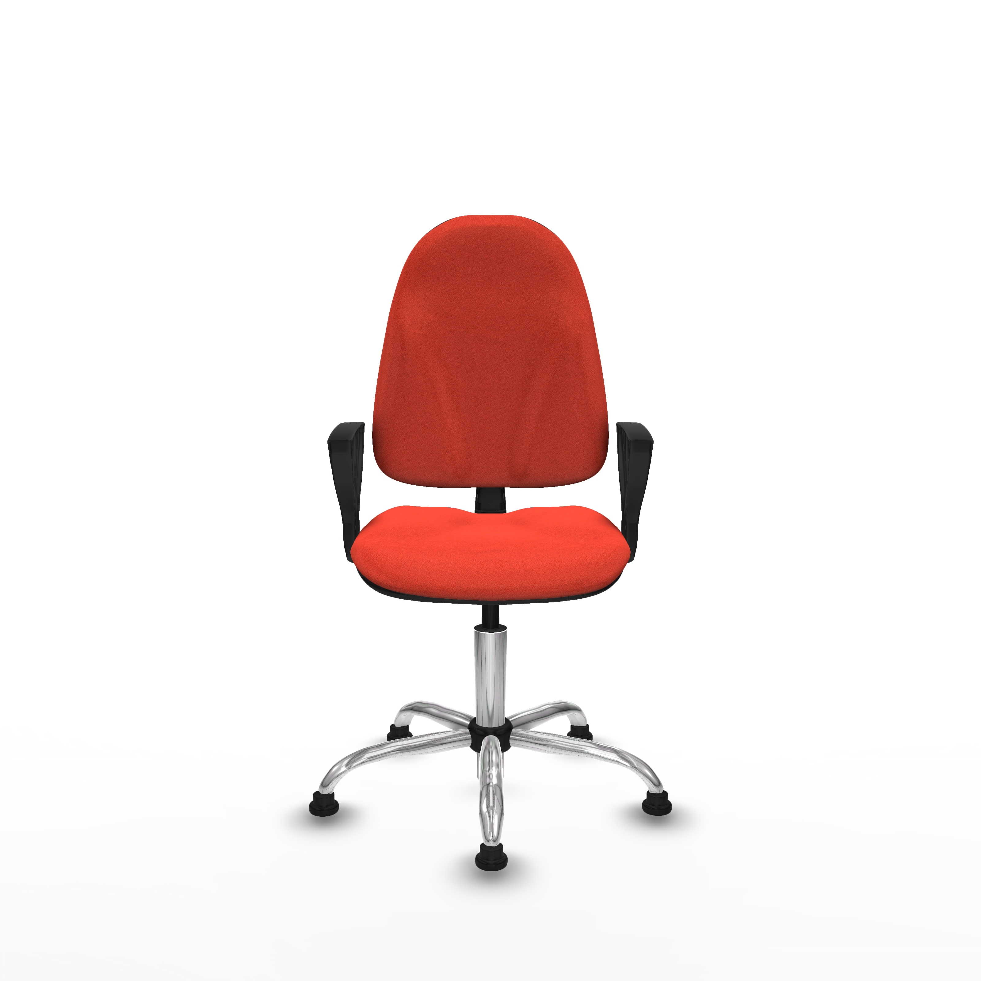 Cuenta con un asiento tipo corte que proporciona confort durante largas jornadas, complementado con un respaldo de 50 cm que ofrece soporte adecuado. La base metálica de 5 radios, con un diámetro de 60 cm y acabado cromado, garantiza resistencia y durabilidad, mientras que los topes de nailon con perno de 11 mm aportan estabilidad sin necesidad de ruedas.