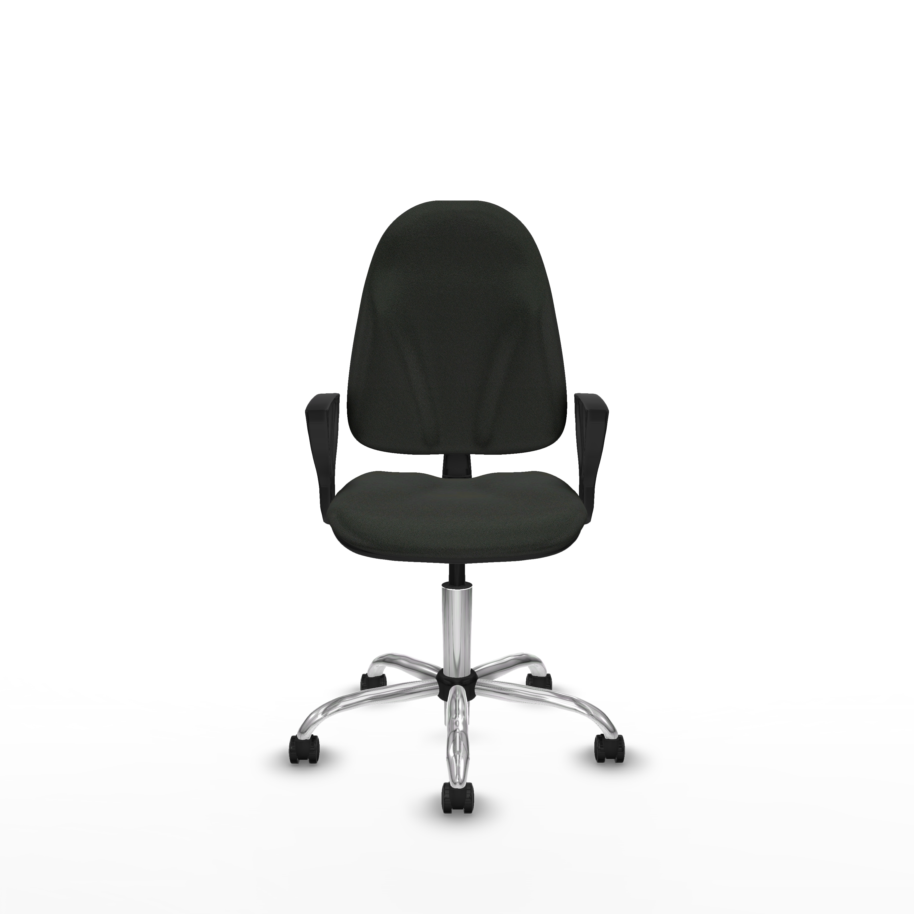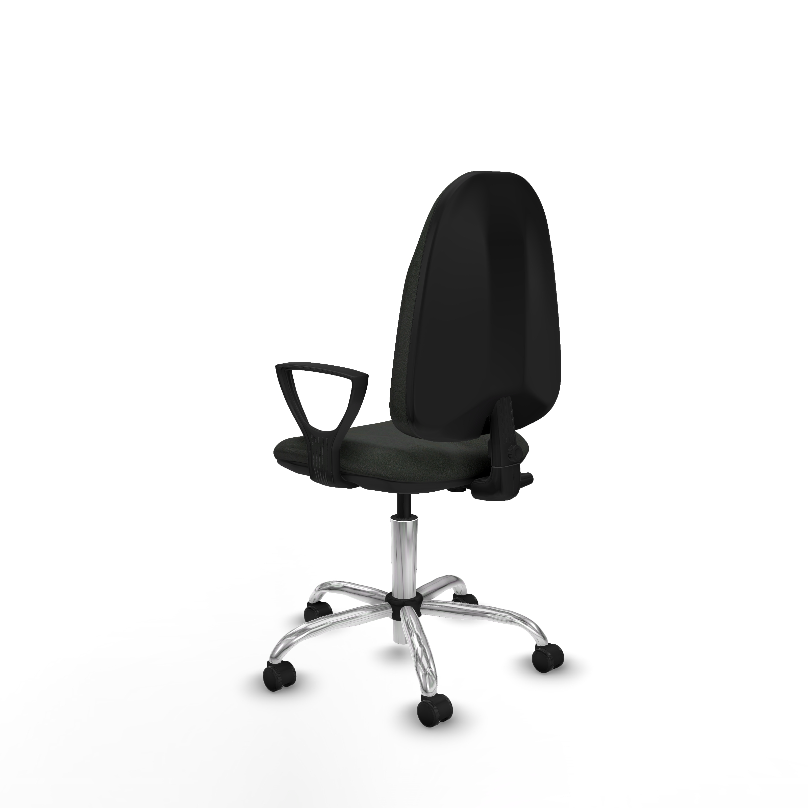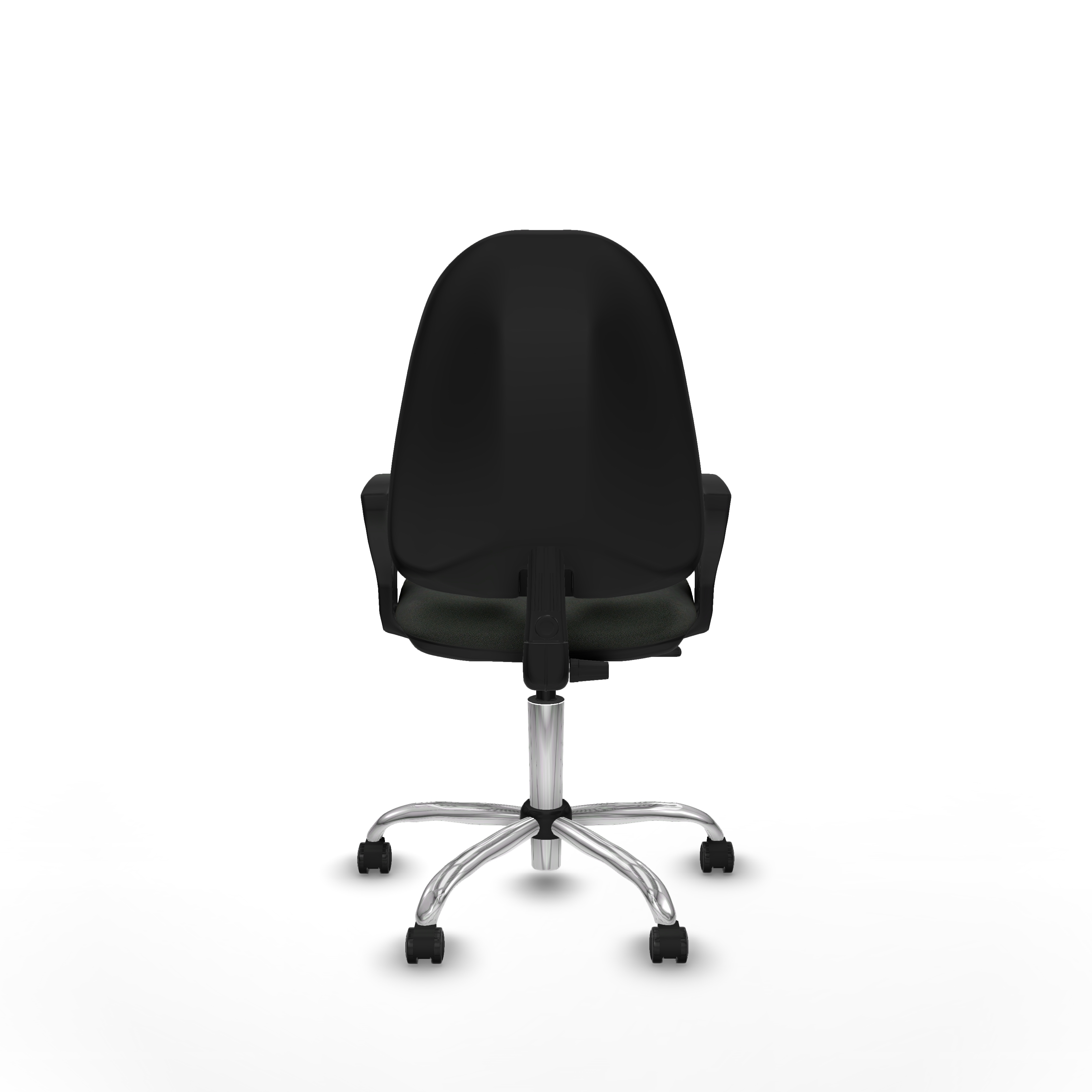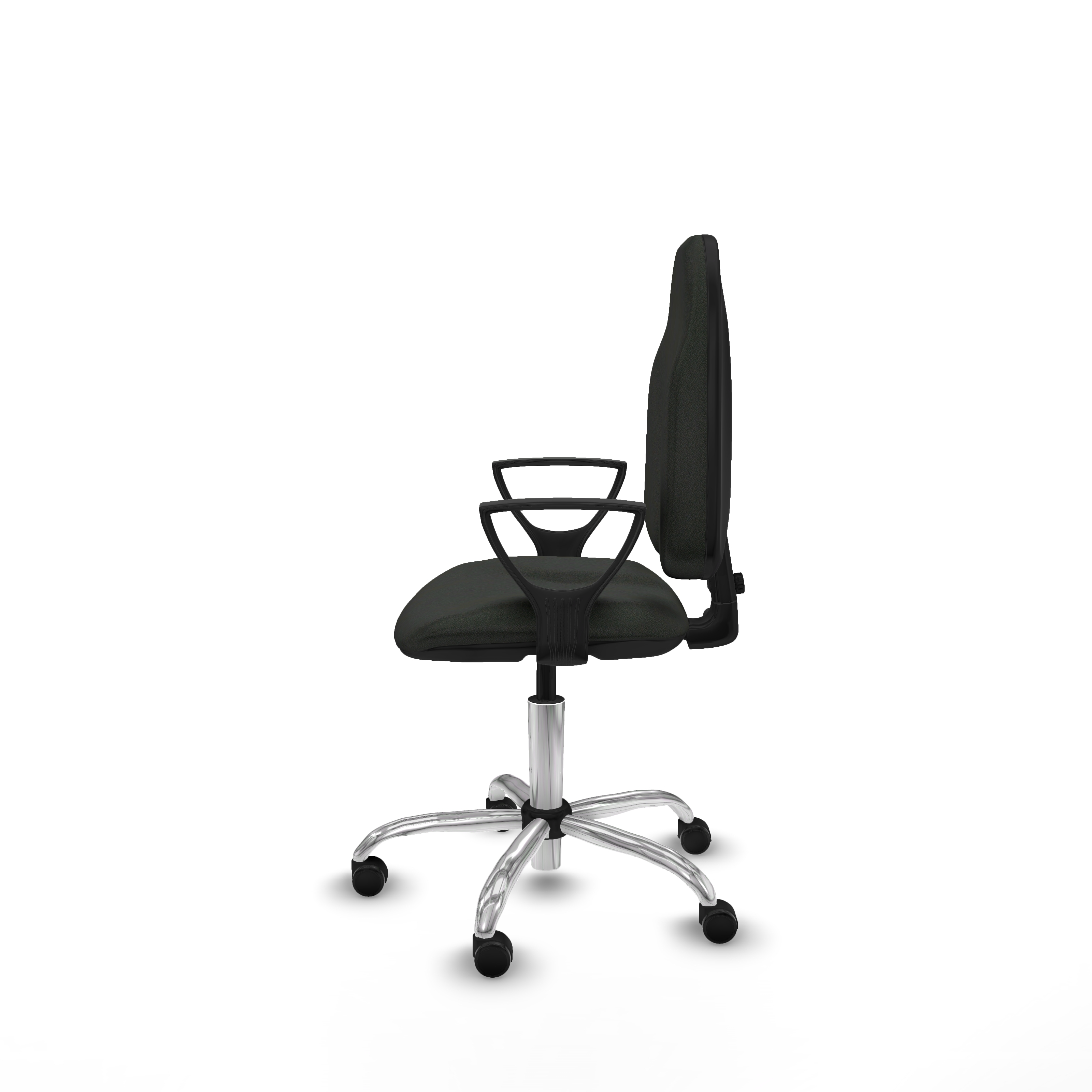 Equipada con ruedas de nailon autofrenantes de 5 cm de diámetro, con eje interno y perno de acero de 11 mm, garantiza movilidad segura y duradera. La base metálica cromada de 5 radios y 60 cm de diámetro aporta estabilidad y un acabado elegante. Los brazos fijos, ajustables en altura entre 65 y 78 cm, ofrecen soporte adicional sin sacrificar espacio.