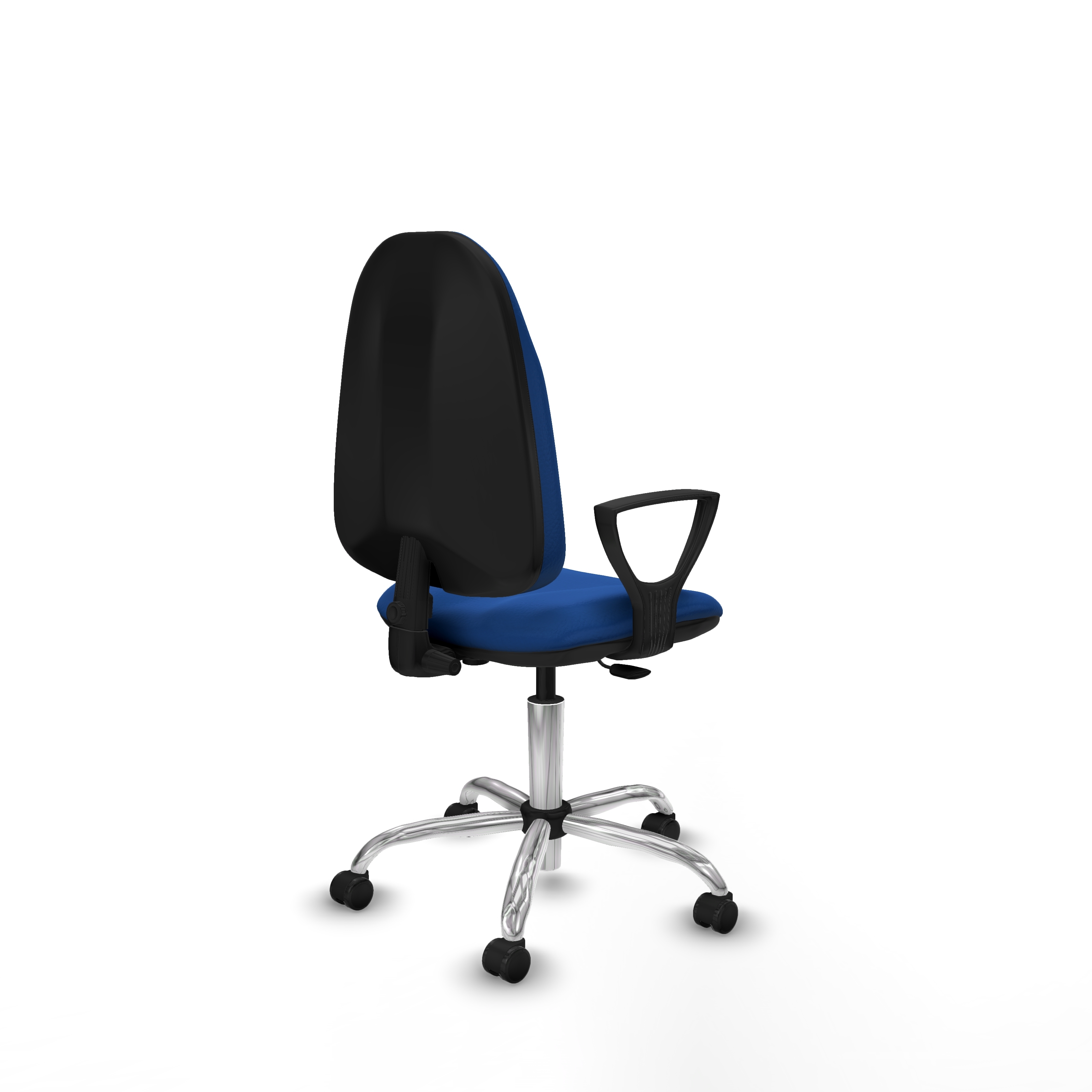 Equipada con ruedas de nailon autofrenantes de 50 mm de diámetro, con eje interno y perno de acero de 11 mm, esta silla giratoria garantiza movilidad segura y duradera. Su base metálica cromada de 5 radios y 60 cm de diámetro aporta estabilidad y un acabado elegante.