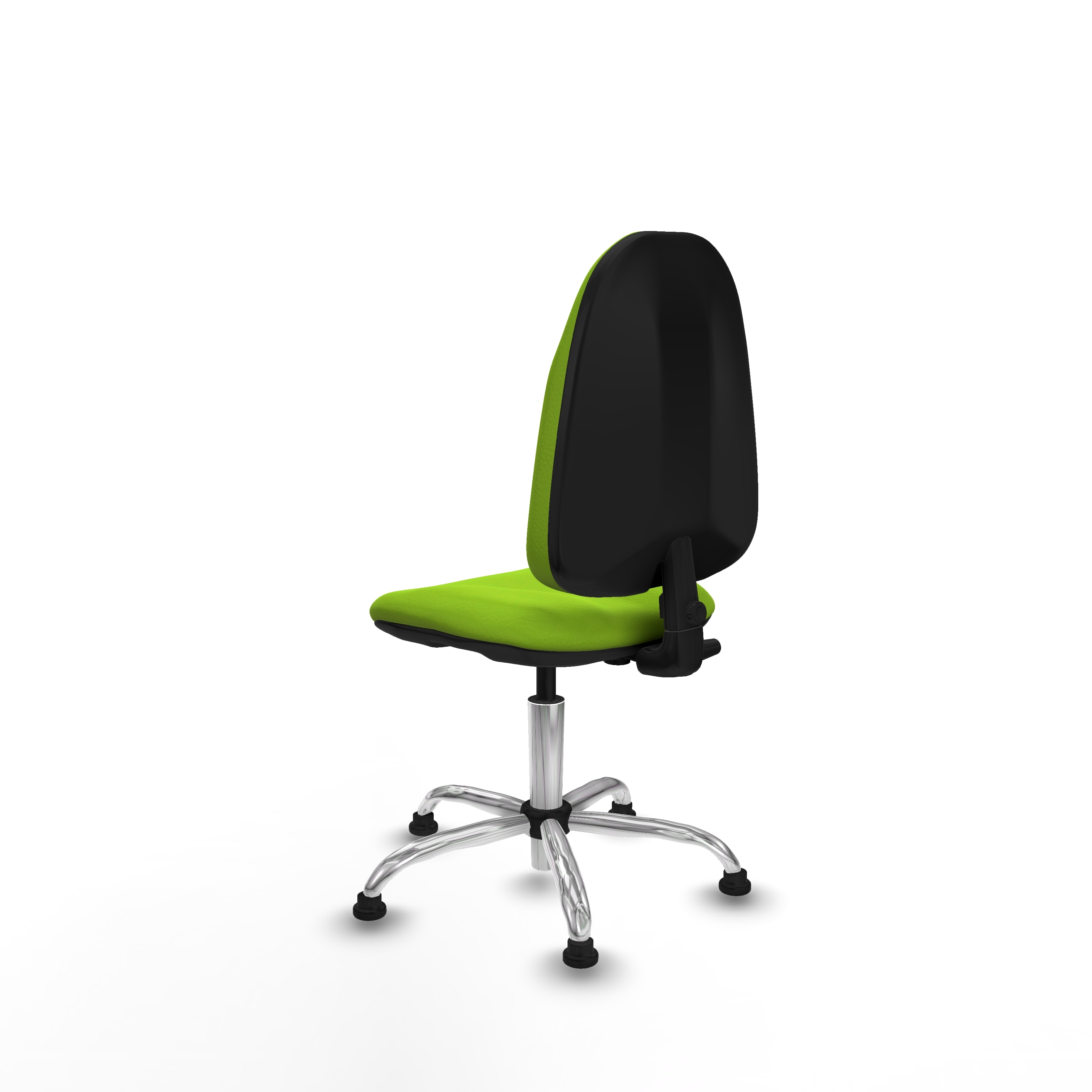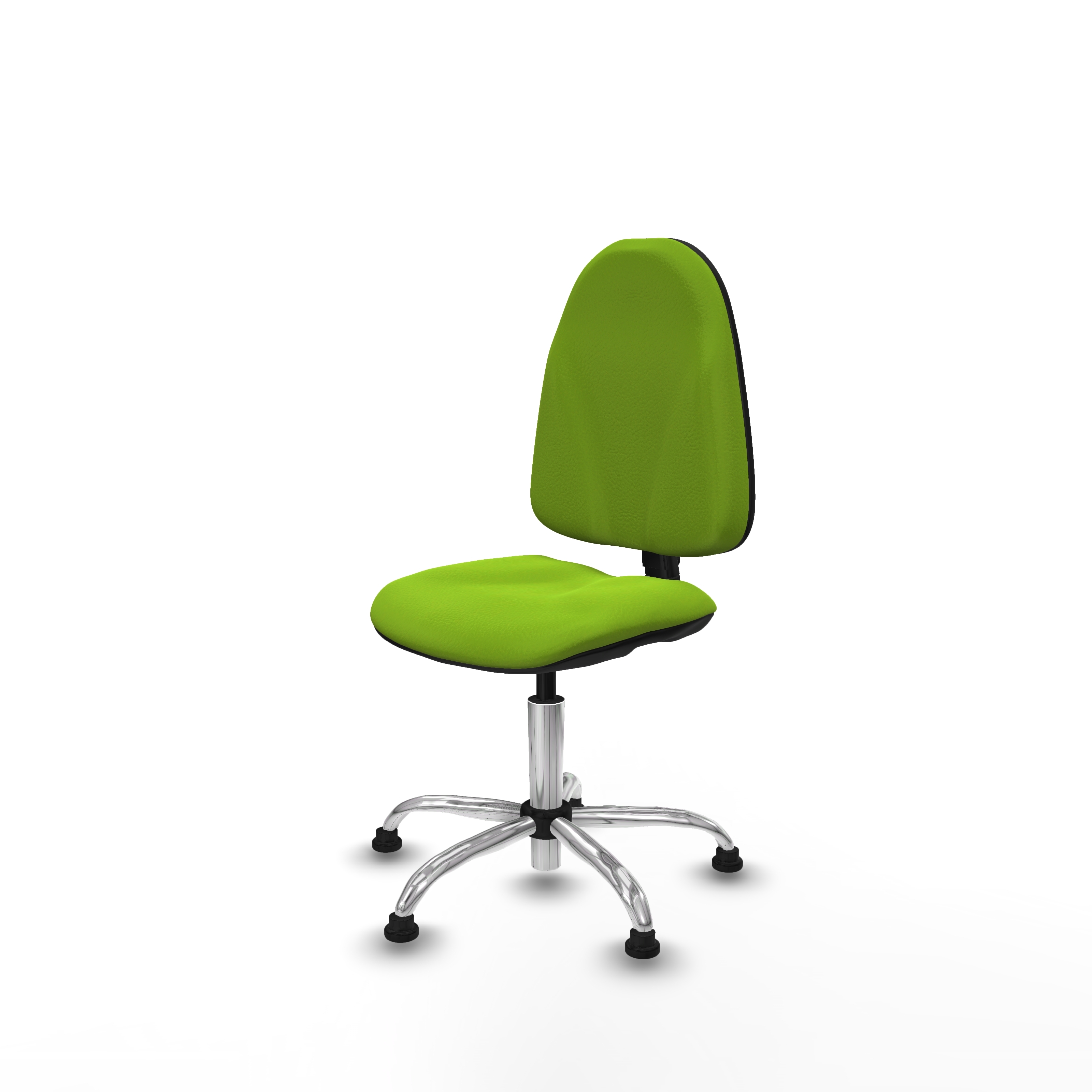 Equipada con ruedas de topes de nailon y perno de 11 mm de diámetro, esta silla permite un desplazamiento suave y seguro. La base metálica cromada de 5 radios, con un diámetro de 60 cm, aporta estabilidad y resistencia, ideal para un uso intensivo.