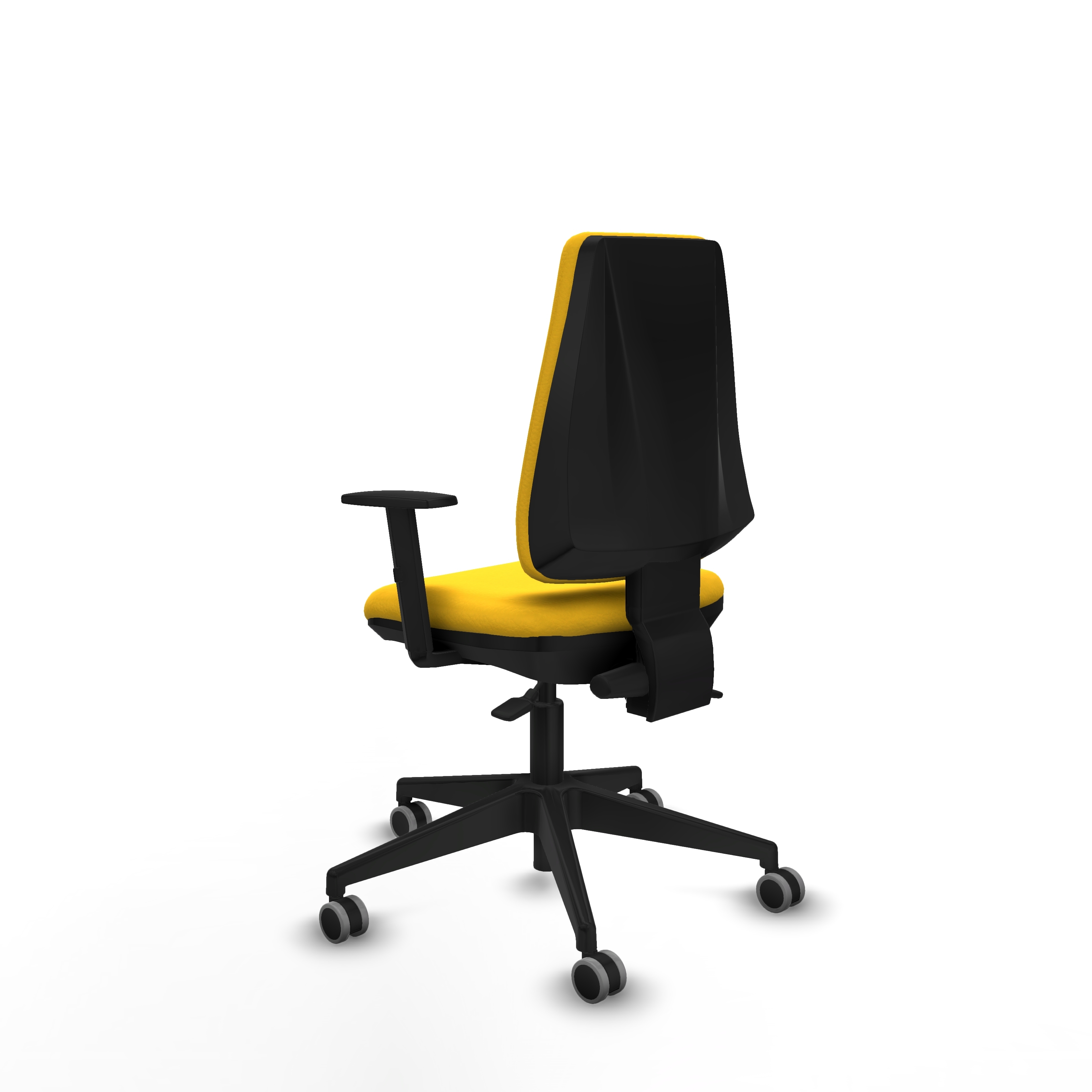 La base piramidal de nailon y fibra de vidrio tiene 5 radios y un diámetro de 64 cm, con un acabado negro que aporta resistencia y estabilidad. El mecanismo asíncrono permite la regulación independiente del asiento y respaldo, adaptándose a las necesidades individuales para maximizar el confort.