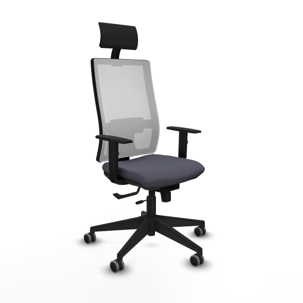 La altura total de la silla varía entre 128 cm y 143 cm, con una regulación del asiento entre 46 cm y 53 cm, lo que la hace perfecta para espacios de trabajo que requieren flexibilidad y ergonomía. Además, incorpora soporte lumbar 1D y cabecero fijo, elementos clave para mejorar la postura y reducir molestias en la espalda.