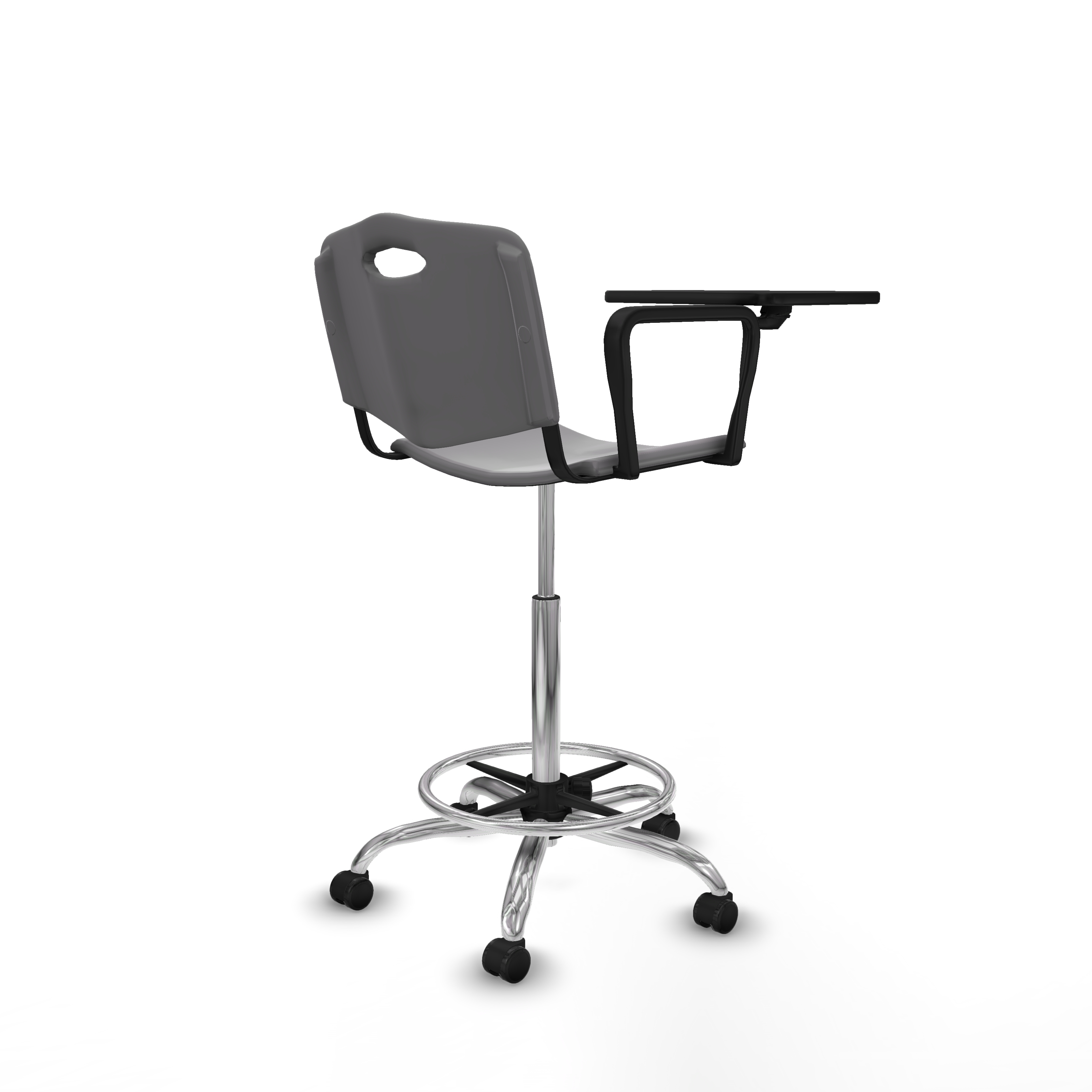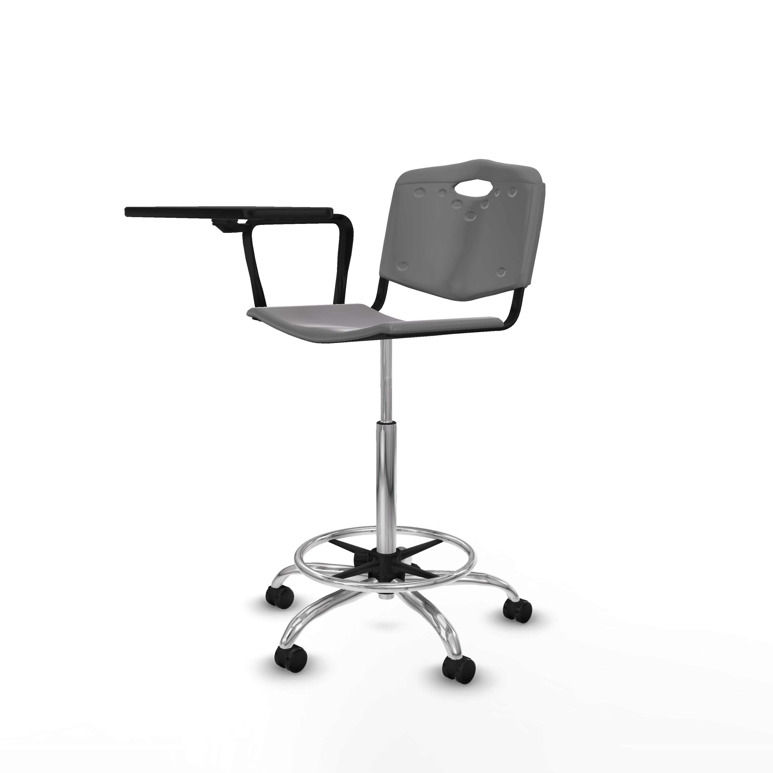 Taburete Robledo giratorio plástico gris claro brazo con pala diestros base cromada ruedas engomadas 50mm